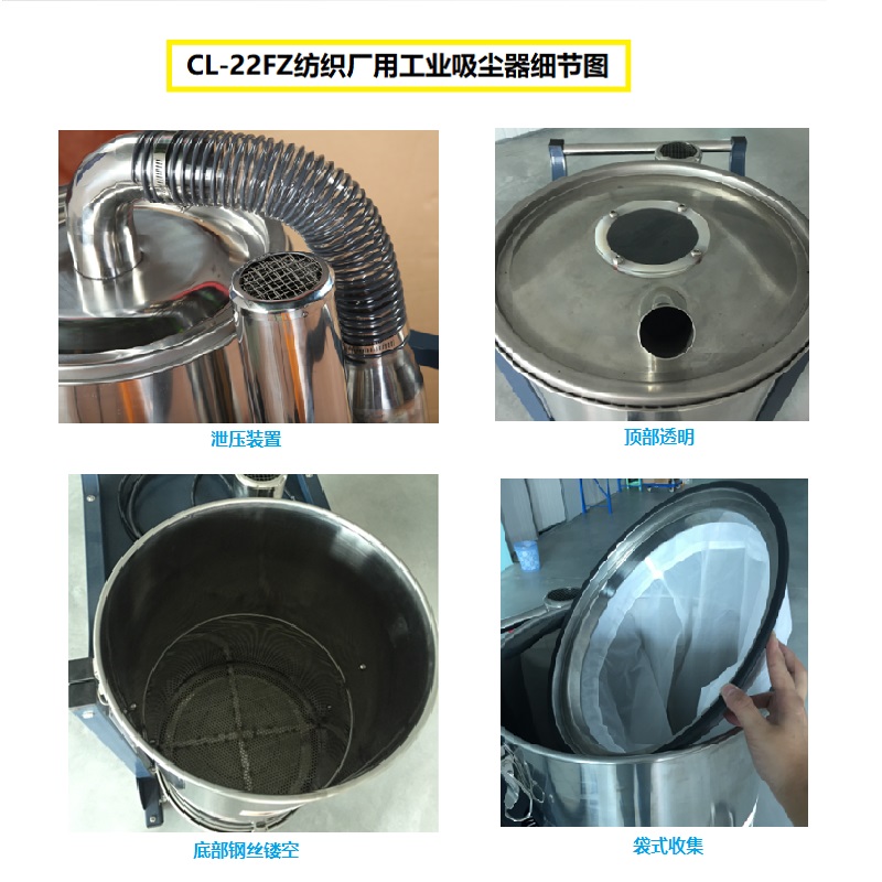 此款纯工业吸尘器应用范围:包装行业在包装机械工作过程中,吸走包装袋;纺织行业吸走纺织机械工作中产生的线头、边料、布纤维、棉絮等;造纸行业生产过程中清理碎屑和灰尘等环境。